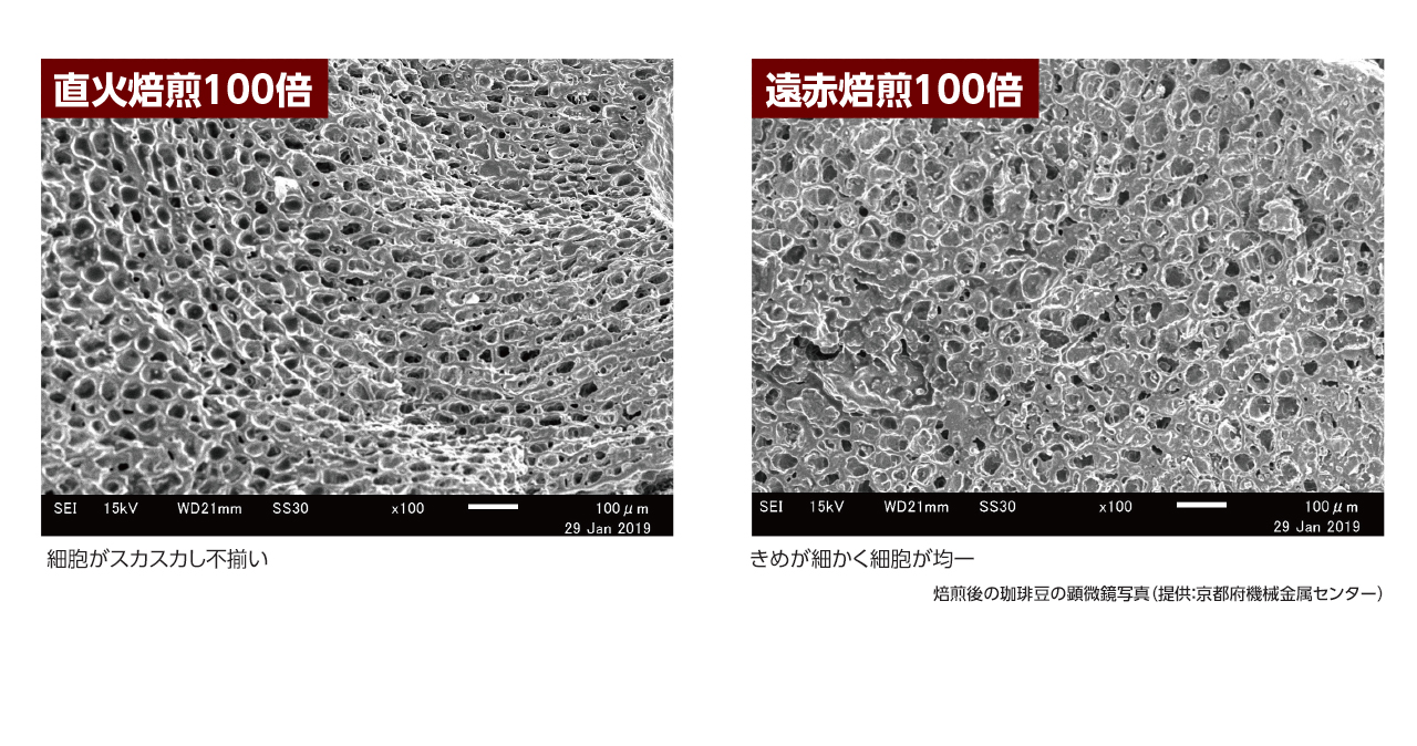 遠赤外線による焙煎は表面を熱する方法と異なり、 深部まで均一になることで豆の組織が 壊れにくい特性があり、深い味わいが長く保たれます。